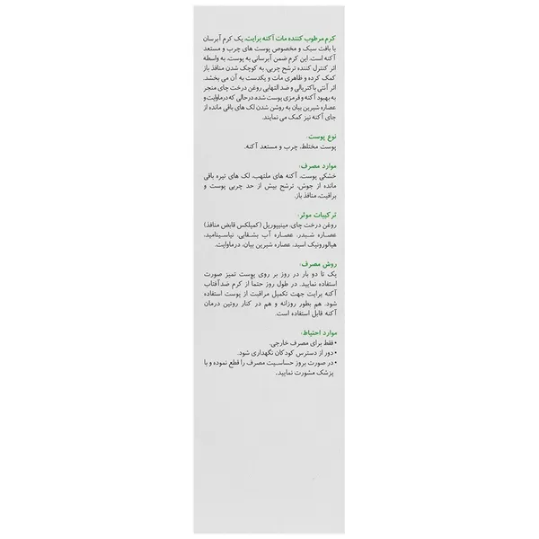 خواص آنتی باکتریالی و ضد التهابی روغن درخت چای به بهبود وضعیت آکنه و کاهش قرمزی پوست کمک می‌کند. همچنین، ترکیب درماوایت و عصاره شیرین بیان به روشن‌تر شدن لک‌های باقی‌مانده از آکنه یاری می‌رساند. این کرم یک گزینه ایده‌آل برای افرادی است که به دنبال حفظ سلامت پوست خود هستند و می‌خواهند ظاهری شاداب و یکنواخت داشته باشند.
