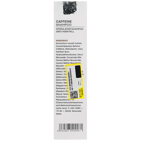 آمونیوم لورت سولفات، کوکامیدوپروپیل بتائین، کافئین، مالتو دکسترین، اوره، زانتان گام، هیدروکسی اتیل سلولز، دسیل گلوکوزاید، کوکامیدو دی اتانول آمید، کوکویل متیل گلوکامید، لوریل متیل گلوکامید، گلیسیرین، عصاره برگ رزماری، عصاره گزنه، عصاره گل بابونه، عصاره برگ مریم گلی، عصاره برگ نعناع فلفلی، پانتنول، اسانس مجاز آرایشی و بهداشتی، دی سدیم ا.د.ت.ا، بوتیلن گلایکول، عصاره میوه سرنوا سرولاتا ، پلی کواترنیوم10، کلرو متیل ایزوتیازولینون و متیل ایزوتیازولینون، اسید لاکتیک، رنگ کد 28440 و 19140 و 15985، آب دیونیزه.