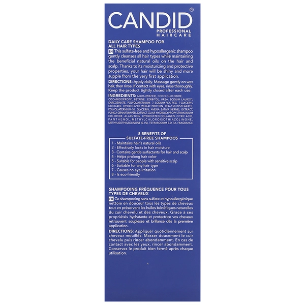 شامپو ویتامینه و پروتئینه روزانه کاندید حاوی ویتامینهای ضروری گروه B، ترکیبات نرمکننده طبیعی و هیدرولیزات پروتئین ابریشم یا کراتین (بسته به فرمول دقیق) برای استحکام بخشی است. عوامل تسکیندهنده ملایم نیز برای اطمینان از کاهش تحریکات و التهابات پوست سر در این محصول گنجانده شدهاند.