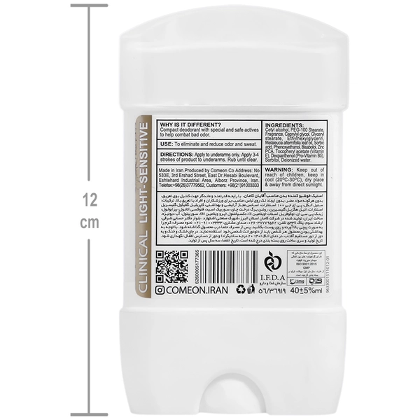 استیک دئودورانت Comeon Clinical Light Sensitive حاصل تخصص برند کامان در ترکیب فرمولهای ملایم و مؤثر ضدتعریق است. این استیک دئودرانت لایت سنستیو کامان برای افرادی طراحی شده که میخواهند بدون استفاده از ترکیبات مضر مانند آلومینیوم، الکل یا پارابن، در طول روز احساس تازگی، تمیزی و اعتمادبهنفس داشته باشند.