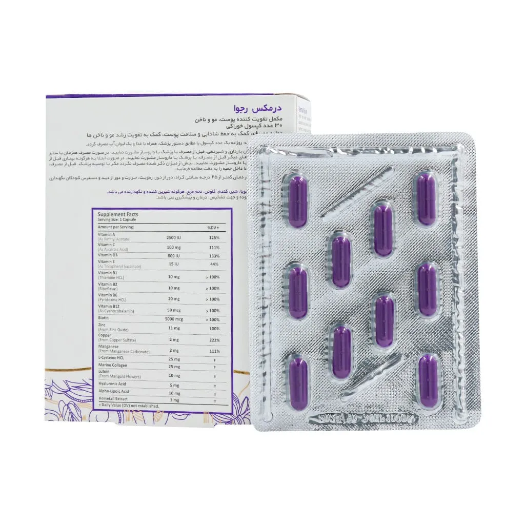 مکمل تغذیه‌ای درمکس رجوا یک ترکیب طبیعی است که به حفظ سلامت و زیبایی پوست، مو و ناخن کمک می‌کند و شادابی و طراوت را افزایش می‌دهد.
