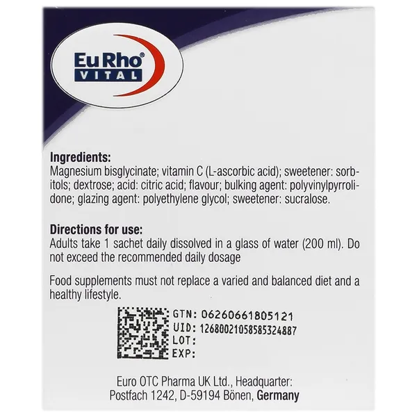 ساشه منیزیم بیس گلیسینات یوروویتال یک مکمل غذایی باکیفیت است که حاوی 150 میلیگرم منیزیم به فرم بیس گلیسینات و 375 میلیگرم ویتامین C میباشد. این محصول با حمایت از عملکرد صحیح سیستم عصبی و عضلانی، کمک به کاهش گرفتگی و اسپاسم عضلات، بهبود خلق و خو و کیفیت خواب، و همچنین بهبود عملکرد قلب و عروق به حفظ سلامت عمومی بدن کمک میکند.