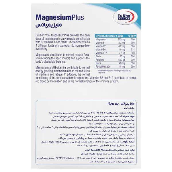 قرص منیزیم پلاس تحت لیسانس شرکت Euro OTC Pharma GmbH آلمان تولید و در هگمتان داروی غرب ایران بستهبندی میشود. هر بسته شامل 30 قرص است.