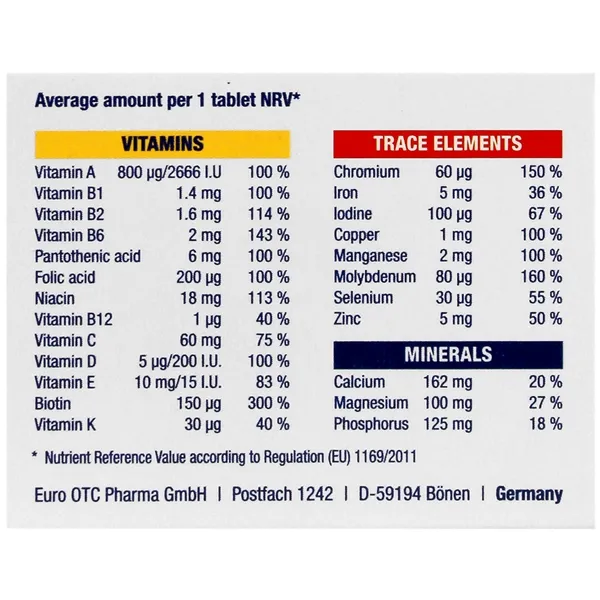 مولتی ویتامین کامپلیت یوروویتال تمام ریز مغذیهای ضروری شامل ویتامینها، املاح معدنی و عناصر کمیاب را در خود دارد که برای عملکرد سالم اعضای حیاتی بدن ضروریاند. این ترکیبات به متابولیسم مواد غذایی و تولید انرژی کمک کرده و برای کاهش علائم خستگی و کمخونی مؤثر هستند. همچنین، این مولتی ویتامین برای حفظ سلامت پوست، مو، ناخن، استخوانها، دندانها و بهبود عملکرد سیستم ایمنی و عصبی بسیار مفید است. ویتامینها و عناصر آنتیاکسیدان موجود در این مکمل همچنین به مقابله با استرس اکسیداتیو و پیشگیری از بیماریهای مزمن کمک میکنند.