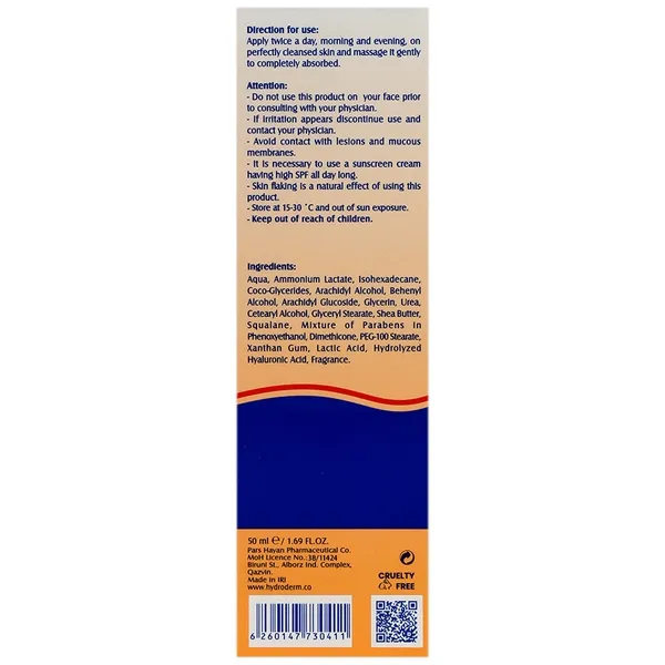 کرم هیدرودرم حاوی ترکیباتی مانند اوره و لاکتات آمونیوم است که بهطور مؤثر سلولهای ضخیم و مرده پوست را لایهبرداری کرده و به نرمی پوست کمک میکند. این ترکیب به عنوان درمانی برای مشکلات پوستی از جمله اگزما و پسوریازیس عمل میکند. علاوه بر این، شی باتر و اسکوالن به تغذیه و آبرسانی پوست کمک کرده و خاصیت ارتجاعی آن را تقویت میکنند.