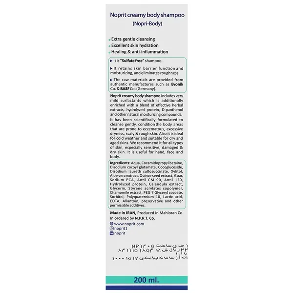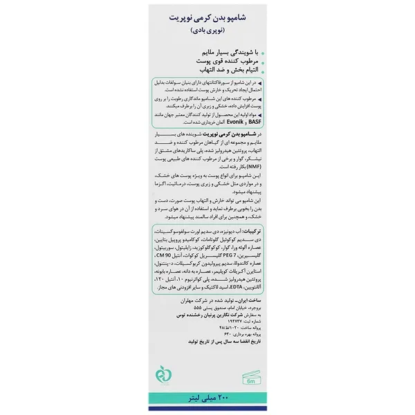 شامپو بدن نوپری بادی نوپریت یک محصول کرمی با طراحی خاص برای پوستهای خشک و معمولی است. این شامپو در تیوپهایی به حجم 200 میلیلیتر در داروخانهها موجود است و از سورفکتانتهای ملایم و عصارههای گیاهی همچون لاواندر، کالاندولا، برگ زیتون و بابونه تشکیل شده است. این فرمولاسیون به خوبی پوست را پاکسازی کرده و از خشکی و دهیدراسیون جلوگیری میکند.