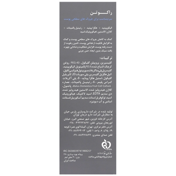 سرم ضد چروک راکوتن یک محصول پیشرفته در زمینه مراقبت از پوست میباشد که برای کاهش چروکهای سطحی و بهبود انعطافپذیری پوست طراحی شده است. با ترکیبات فعال مانند الیگوپپتید و هگزاپپتید، این سرم اثراتی مشابه بوتاکس ایفا میکند. این پپتیدها با جلوگیری از انتقال سیگنالهای عصبی-عضلانی در پوست، به کاهش انقباضات عضلانی کمک کرده و از تشکیل خطوط و چروکهای جدید جلوگیری میکنند.