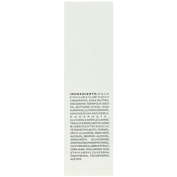 این کرم شامل آکوا، اتیل هگزیل متوکسی سینامات، شی باتر، روغن دانه ماکادمیا و دیگر ترکیبات موثر مانند ویتامین C و هیالورونیک اسید است که همگی به بهبود کیفیت پوست کمک میکنند.