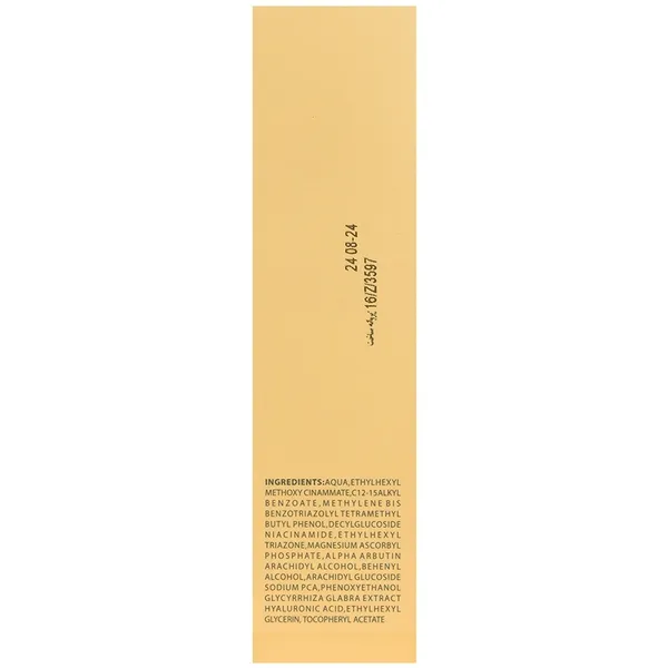 آب، اتیل هگزیل متوکسی سینامات، C12-15 آلکیل بنزوات متیلن بیس بنزوتریازولیل تترا متیل بوتیل فنل، دسیل گلوکوزاید، نیاسین آمید، اتیل هگزیل تریازون، منیزیم آسکوربیل فسفات، آلفا آربوتین، آراشیدیل الکل، بهنیل الکل، آراشیدیل گلوکوزاید، سدیم پی سی ای، فنوکسی اتانول، عصاره شیرین بیان، هیالورونیک اسید، اتیل هگزیل گلیسرین، توکوفریل استات.