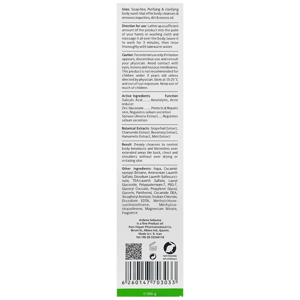 شوینده بدن آردن سبوما یک راهکار مؤثر برای بهبود و رفع مشکلات مرتبط با پوست چرب و مستعد آکنه است. این محصول که بر پایه مواد مؤثرهای همچون سالیسیلیک اسید، زینک گلوکونات و عصاره گریپ فروت تهیه شده، بهخوبی آلودگیها و چربیهای اضافی را از پوست پاک کرده و به تنظیم ترشح چربی غدد سباسه کمک میکند.