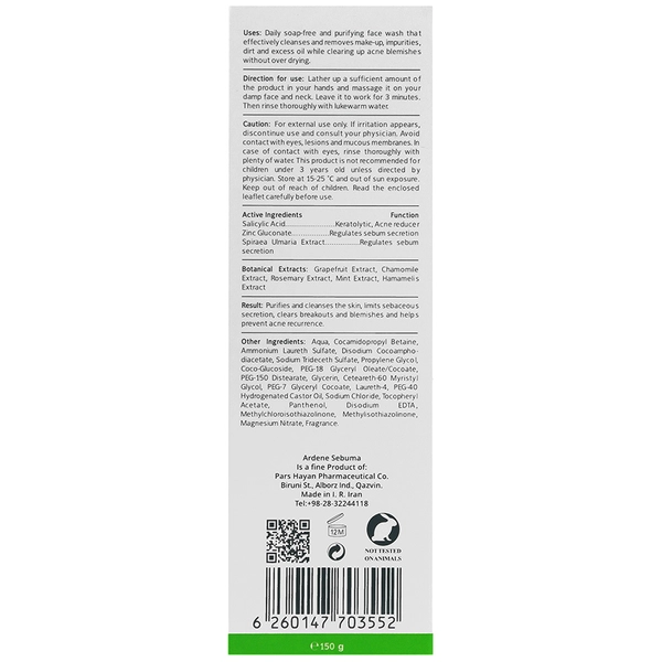 شوینده صورت سبوما آردن فاقد الکل، پارابن و رنگهای مصنوعی است و با ایجاد کف مناسب، پوست را بهآرامی شسته و تحریک یا خشکی ایجاد نمیکند. این محصول مناسب برای افراد بالای 3 سال طراحی شده و از نظر هیپوآلرژیک و غیر کومدونزا بودن، قابلیت استفاده برای پوستهای حساس را دارد.