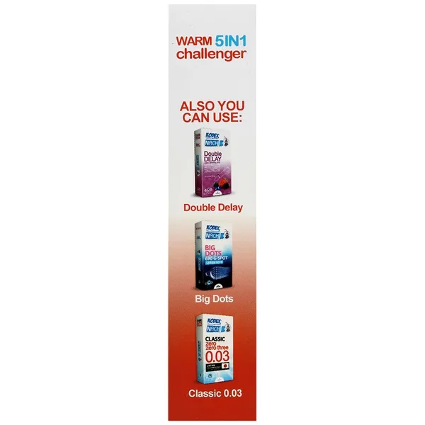 کاندوم 5 کاره گرم کدکس با ترکیبی از لوبریکانتهای LA و NI طراحی شده که بهطور مؤثری درمقابل زودانزالی آقایان عمل میکند. این کاندوم همچنین حاوی ژل انار است که هنگام استفاده، حس گرما را ایجاد میکند. با رایحه مطبوعی که این کاندوم دارد، تجربهای تحریکآمیز و لذتبخش در زمان نزدیکی فراهم میآورد. بستهبندی این کاندوم بهصورت دوتایی و به تعداد 12 عدد عرضه میشود و بهخصوص برای استفاده یکبار مصرف طراحی شده است.