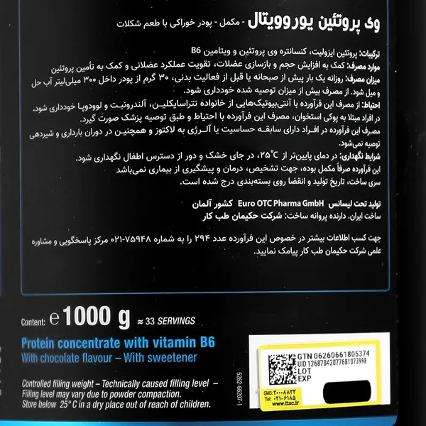 این محصول تحت لیسانس آلمان و بهنمایندگی شرکت حکیمان طب کار، در کارخانه داروسازی هگمتان داروی غرب تولید و بستهبندی میشود. پروتئین وی یوروویتال در بستهبندی 1000 گرمی و در دو طعم شکلات و وانیل در دسترس است و هر قوطی حاوی 33 سروینگ با 22 گرم پروتئین در هر سروینگ میباشد.